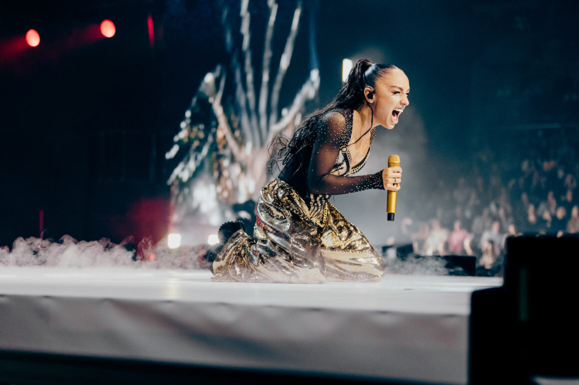 Особое впечатление произвели воздушные трюки. Мари Краймбрери летала под куполом арены без страховки, демонстрируя полное владение телом. Это не спектакль ради эффекта — в детстве певица серьёзно занималась танцами и акробатикой.