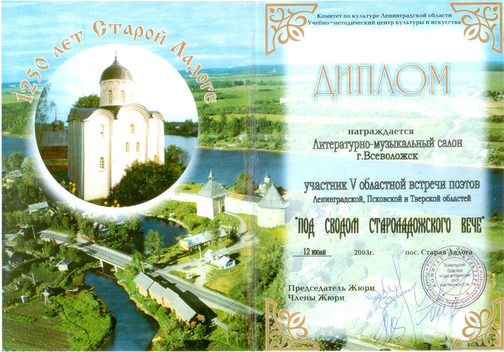 12 июля 2003 года в живописном городке Старая Ладога, уютно разместившемся на крутом берегу степенного Волхова, состоялась V областная встреча поэтов и бардов Ленинградской, Псковской и Тверской областей «Под сводом Староладожского Вече». Встреча проходила на территории древней крепости под открытым небом. На данной встрече наш район был представлен наиболее активными участниками литературно-музыкального салона «Родник», что при Всеволожском Доме Культуры. Первым от Всеволожского района выступил, уже завоевавший широкую популярность в районе и в области — певец Владимир Ауза, который буквально привел в восторг присутствующих. Затем выступил гордость Всеволожского района дипломант (в номинации высокая духовность), прошедшего накануне в Старой Ладоге I областного фестиваля бардовской песни «И вновь звучат гитар встревоженные струны» —автор-исполнитель Николай Ерёмин. Всеволожских поэтов представлял на импровизированной сцене поэт Сергей Васильев. Свое стихотворение «Корона