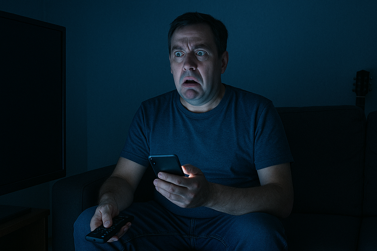 Сижу, не двигаюсь, сцена напряжённая — герой вот-вот скажет ключевую фразу. И тут экран гаснет. Тишина. Даже подсветка плавно уходит в серый. Я пару секунд просто моргал в темноту, пока колонка бодро не объявила: «Режим отсутствия активирован. Энергия сохранена.» Комната в холодных тонах, телевизор только что погас, человек сидит в темноте с пультом в руке, на лице смесь шока и раздражения, свет от экрана телефона освещает контуры, стиль реалистичный с долей комедии, горизонтальная сцена.