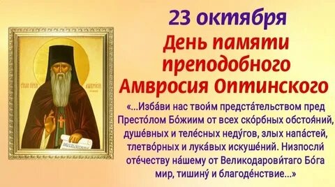 23 октября 2025 года - четверг, седмица 20-я Православная Церковь чтит память: — Мученика Евлампия и мученицы Евлампии (303–311) — Преподобного Амвросия Оптинского (1891) -------------------------------------------- Поздравляем всех именинников с днем Ангела! https://xn----7sbahbba0chrecjllhdbcuymu3s.xn--p1ai/07_calendar/10/23.html ------------------------------------------- 🍵 ПОСТ И ТРАПЕЗА 23 октября 2025 г., четверг, поста нет ------------------------------------------- 💠ИСТОРИЧЕСКИЕ СОБЫТИЯ — 23 октября 1937 г. начался героический дрейф ледокола «Георгий Седов» — 23 октября 1942 г. началось второе сражение при Эль-Аламейне в ходе Второй Мировой Войны — 23 октября 2002 г. в театре на Дубровке террористы захватили заложников во время мюзикла «Норд-Ост» --------------------------------------------- 👀 ИНТЕРЕСНЫЕ ФАКТЫ ИЗ ЖИТИЯ СВЯТЫХ И ИСТОРИИ ПРАЗДНИКА — Будущий великий оптинский старец иеросхимонах Амвросий родился 4 декабря 1812 года в селе Большая Липовица Тамбовской