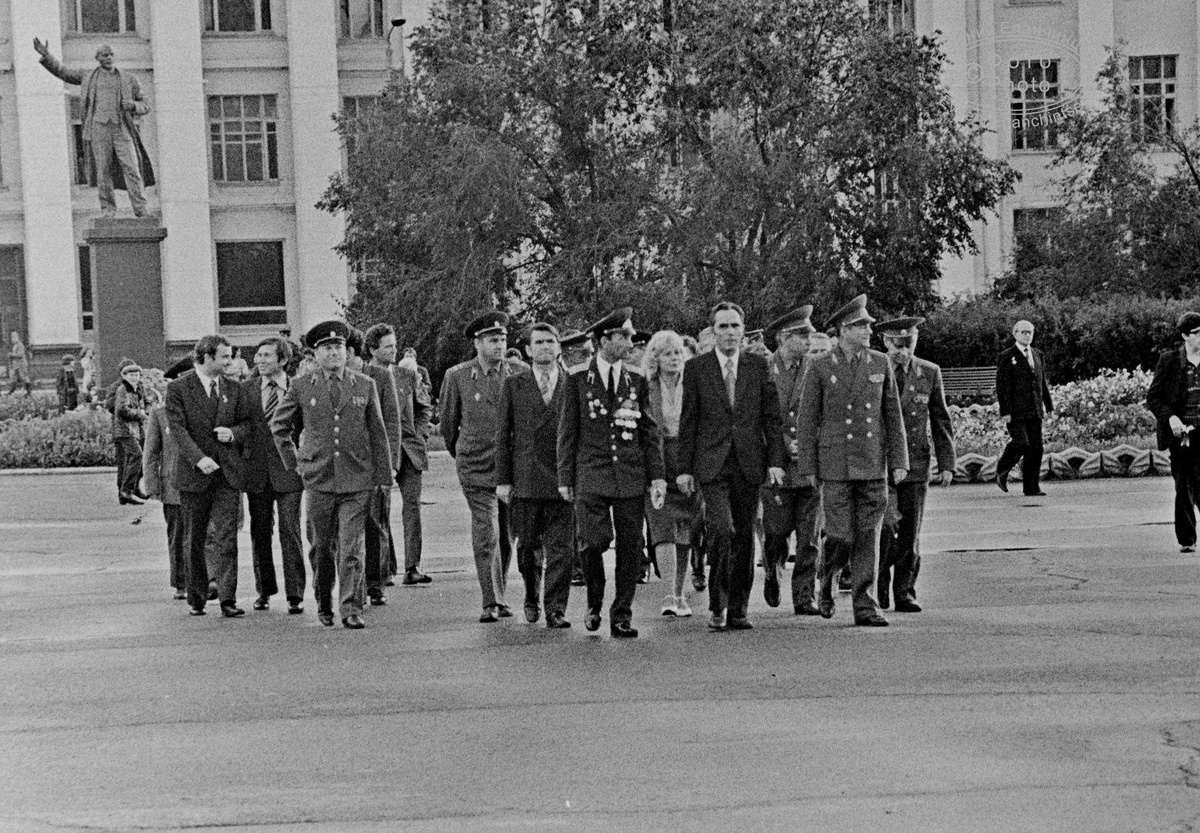 📷 Площадь Ленина. Партийные руководители и офицеры ЗабВО на торжественном митинге по случаю 30-летия победы над милитаристской Японией и окончания II мировой войны — идут к ветеранам после возложения венка к старому памятнику Ленину.