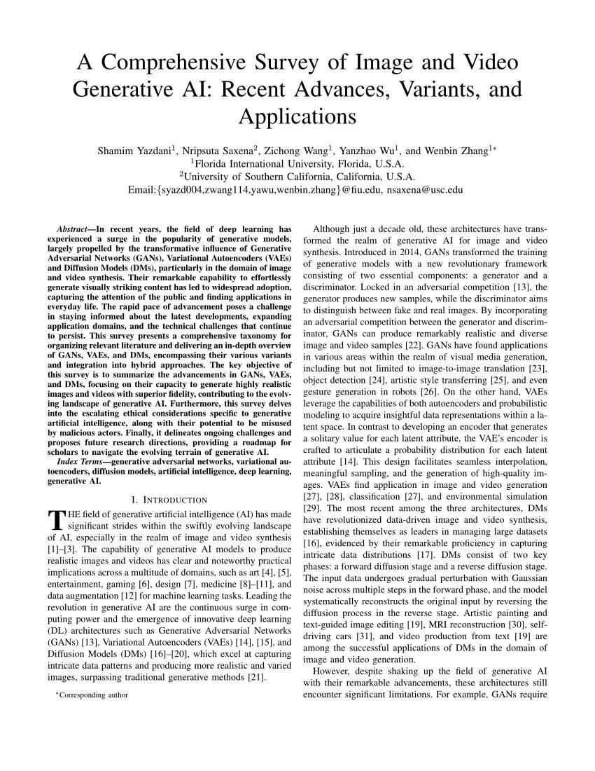 Область генеративного искусственного интеллекта (ИИ) добилась значительных успехов в быстро развивающемся ландшафте ИИ. Возможность генеративных ИИ моделей создавать реалистичные изображения и видео имеет очевидные практические последствия в различных областях, таких как искусство, развлечения, игровой дизайн, медицина и аугментация данных для задач машинного обучения. Лидерами революции в генеративном ИИ являются постоянно растущая вычислительная мощность и появление инновационных архитектур глубокого обучения, таких как Генеративные Соревнующие Сети (GAN), Вариационные Автокодировщики (VAE) и Модели диффузии (DM). В последние годы глубокое обучение на основе генеративных моделей, особенно GAN, VAE и DMs, сыграло ключевую роль в создании разнообразного, высококачественного контента в различных областях, таких как синтез изображений и видео. Эта способность привела к широкому принятию этих моделей и вызвала большой общественный интерес. Так как эти модели продолжают быстро развивать