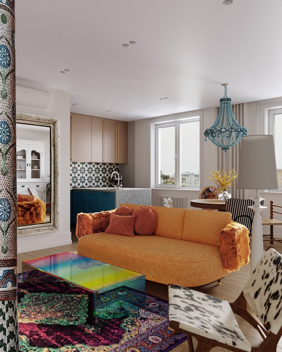 Сердце гостиной - оранжевый диван с меховой спинкой. Он словно солнце, наполняет пространство теплом и уютом.