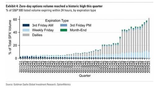 🔸Доля опционов с нулевым сроком до экспирации (0DTE) в объеме торгов по S&P 500 превысила 60% в прошлом квартале, достигнув абсолютного