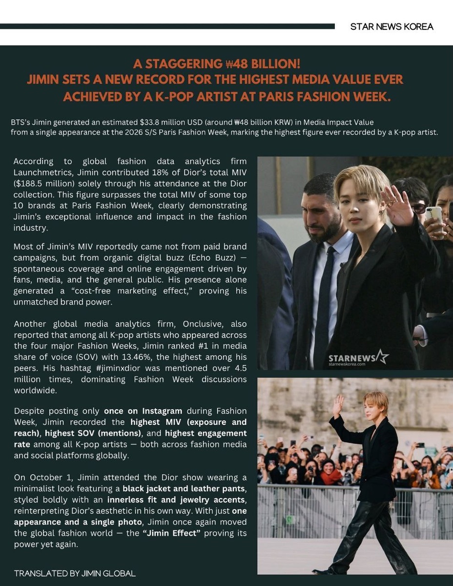K-Media сообщает, что Чимин установил новый рекорд, достигнув наивысшего показателя Media Impact Value среди исполнителей K-pop на Парижской неделе моды, что демонстрирует его влияние и воздействие в индустрии моды.