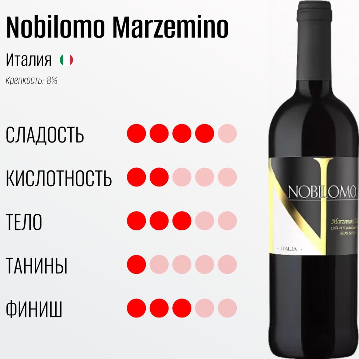В мире итальянских вин есть жемчужины, которые не стремятся поразить сложностью, а очаровывают с первого глотка. Nobilomo Marzemino — именно такая находка. Это красное полусладкое вино из солнечной Италии создано из винограда сорта Мардземино — настоящей легенды северных регионов страны. Дегустационные заметки При первом знакомстве вино раскрывается насыщенным ягодным букетом, где доминируют тона спелой вишни и лесной малины. К ним присоединяются едва уловимые ноты фиалки и миндаля, создавая сложную и при этом удивительно гармоничную ароматическую композицию. Во вкусе — настоящая симфония спелых фруктов. Мягкая, округлая текстура обволакивает нёбо, а хорошо сбалансированная кислотность придает вину свежесть и питкость. Танины практически не ощущаются, что делает его идеальным выбором для тех, кто предпочитает деликатные красные вина без излишней терпкости. Сердце вина: Трентино и его наследие Мардземино — автохтонный сорт, исторически произрастающий в регионе Трентино-Альто-Адидже