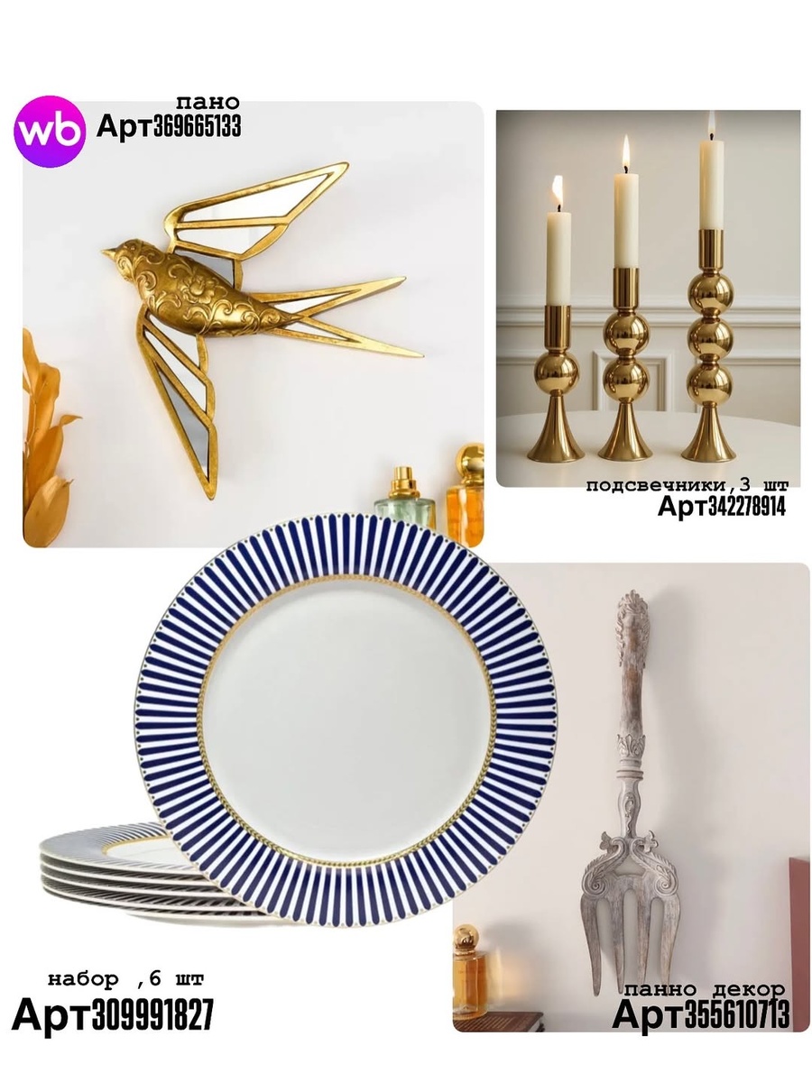 Эти двенадцать предметов создают единый язык вашего дома: золото даёт торжественность, керамика — уют, дерево — теплоту, текстиль — мягкость, а свет свечей связывает всё в одну историю. Берите артикулами, собирайте композиции, смело миксуйте современную графику с винтажными мотивами — и ваше пространство зазвучит по-новому: интеллигентно, гостеприимно и очень красиво.