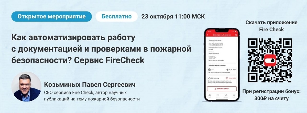 📣 Штрафы, хаос, потеря времени? Решение для автоматизации пожарной безопасности Если вы специалист по ПБ на объекте или руководитель организации и ведение пожарной безопасности ваших объектов отнимает все силы и ресурсы — приглашаем на практический стрим, где покажем, как облегчить жизнь и экономить время. FireCheck — сервис, который помогает проверить объект на соответствие требований по пожарной безопасности, найти подрядчиков или контролировать и фиксировать выполнение работ. На стриме подробнее обсудим: ✅ Экспресс проверку объекта (мини аудит) — менее чем за 1 минуту проверим выполнение основных требований ПБ для объекта защиты ✅ Электронный журнал эксплуатации СПЗ — позволяет автоматически сформировать список работ по всем системам для каждого объекта. ✅Систему хранения данных — позволяет сформировать перечень обязательных документов по объектам защиты и хранить их в электронном виде. ✅ Взаимодействие с подрядчиками — через сервис можно отправить техническое задание подря