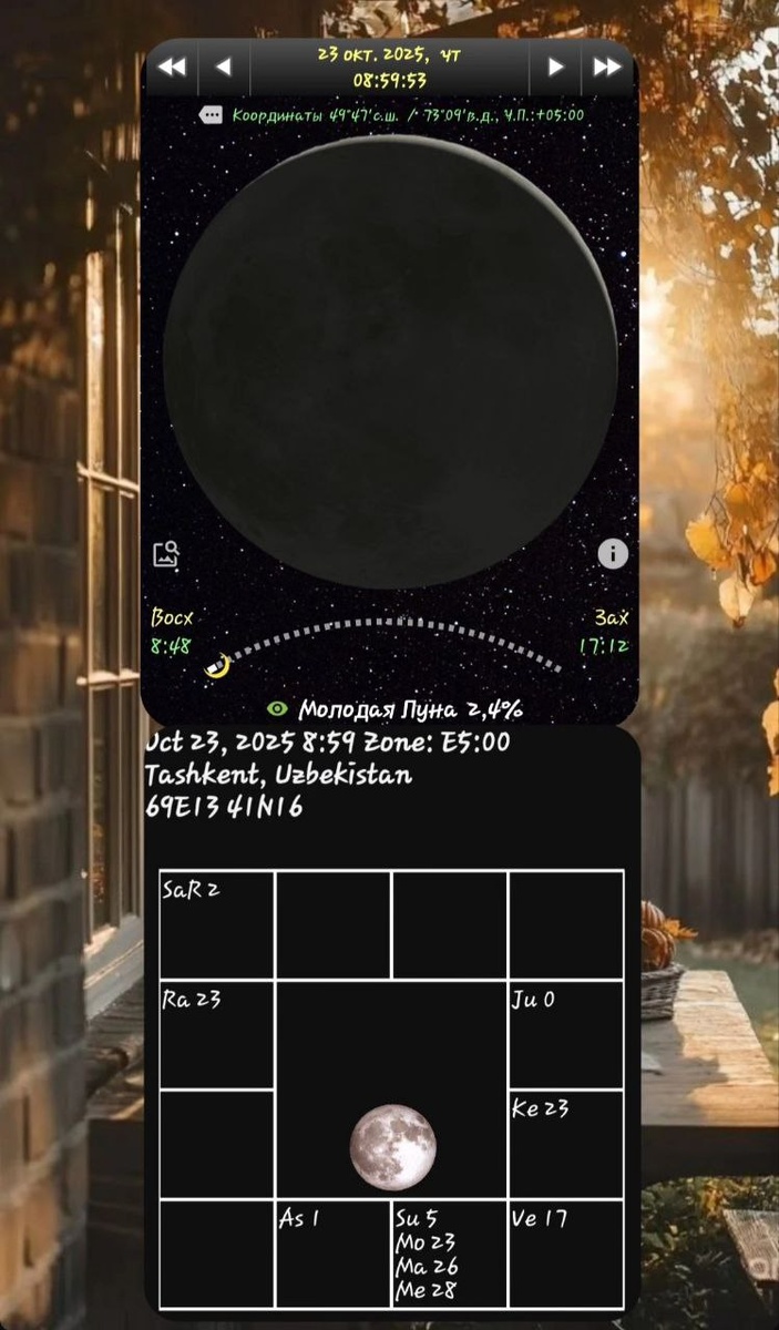 🍃🌜23.10.2025.🌛🍃 Ведическая Астрология Молодая Луна на границе Весов и Скорпиона. РетроСатурн. Юпитер меняет знак. 🍂🌛Молодая Луна начинает подрастать и наполняться энергией. Если сегодня очень сильно захочется выяснить отношения, постарайтесь сдержаться и поговорить спокойно, либо через несколько дней. Если всё же чувствуете, что накипело, поговорите сначала со своим котом, собакой, попугаем, рыбами или цветком. 🥧С людьми разговаривать об отношениях лучше в спокойном состоянии, взвешивать сказанные слова и наблюдать за эмоциями, если вы хотите отношения сохранить. Если хотите порвать связи - лучше дня не найти. 🪵🌛Луне сегодня, как никогда нужен баланс, уже вечером она уходит в Скорпиона, где стоит ловить вдохновение от любимых фильмов, чудных мест, природы и людей, с которыми вам хорошо. 🍫🍫🌛Держим себя в руках и помним, что всё вращается и меняется, а то, в чем сейчас видится бездна, завтра может раскрыть новую дверь(обычно, так и случается) 🍪Сохраните отношения и вн