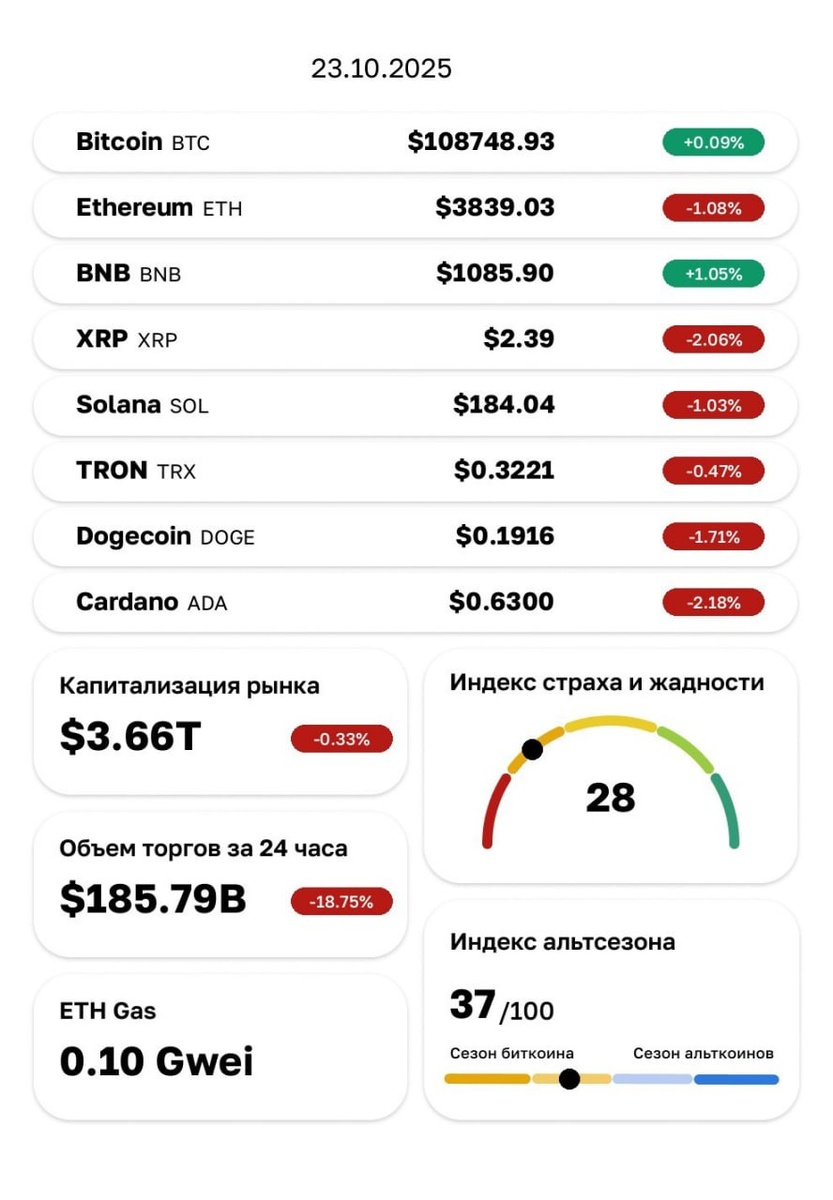 ☕️ Крипторынок на утро 23.10.2025 Индекс страха и жадности: 28 Индекс альтсезона: 37 Доминация BTC: 59,91% 😢 Ликвидации: За последние 24 часа было ликвидировано на общую сумму $418.54K Лонг $222.02K Шорт $196.51K Лонг/Шорт держатели BTC: 🙈 Лонг: 61,18% Шорт: 38,82% Дневник Криптоинвестора🚦