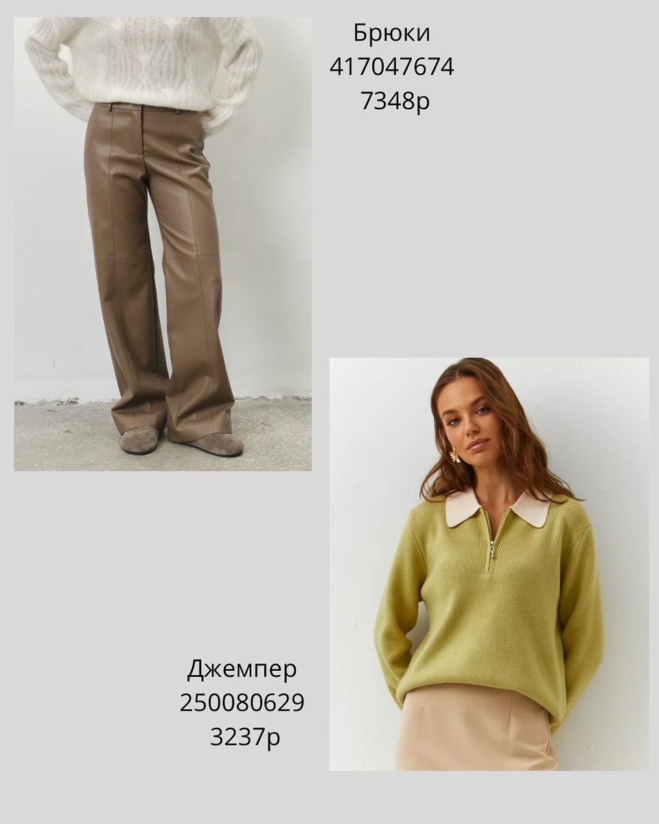 Когда в воздухе появляется прохлада, хочется вещей, которые держат форму, создают чистую линию силуэта и легко комбинируются между собой. Эта мини-капсула именно такая: спокойные природные оттенки, благородные фактуры и удобные посадки. Иду строго по порядку, как на фото, у каждой позиции — подробное описание и совет стилиста. арт. 417047674 · 7348 ₽ Крой и посадка. Прямой силуэт со свободным шаговым швом и аккуратной посадкой на талии. Вертикальные рельефы спереди работают как «стрелки» и визуально вытягивают ноги. Длина — до касания с обувью, что делает низ более тяжёлым и благородным. Материал. Плотная экокожа спокойного кофейного оттенка с мягким матовым блеском. С изнанки — приятная подкладка, которая не цепляется за колготки. С чем носить. Объёмные свитеры, рубашки навыпуск, тонкие водолазки. В обуви — жёсткие лоферы, казаки, ботинки на устойчивом каблуке. Совет стилиста. Чтобы линия ноги казалась бесконечной, подберите обувь в тон брюк и слегка прикройте её кромкой — получится