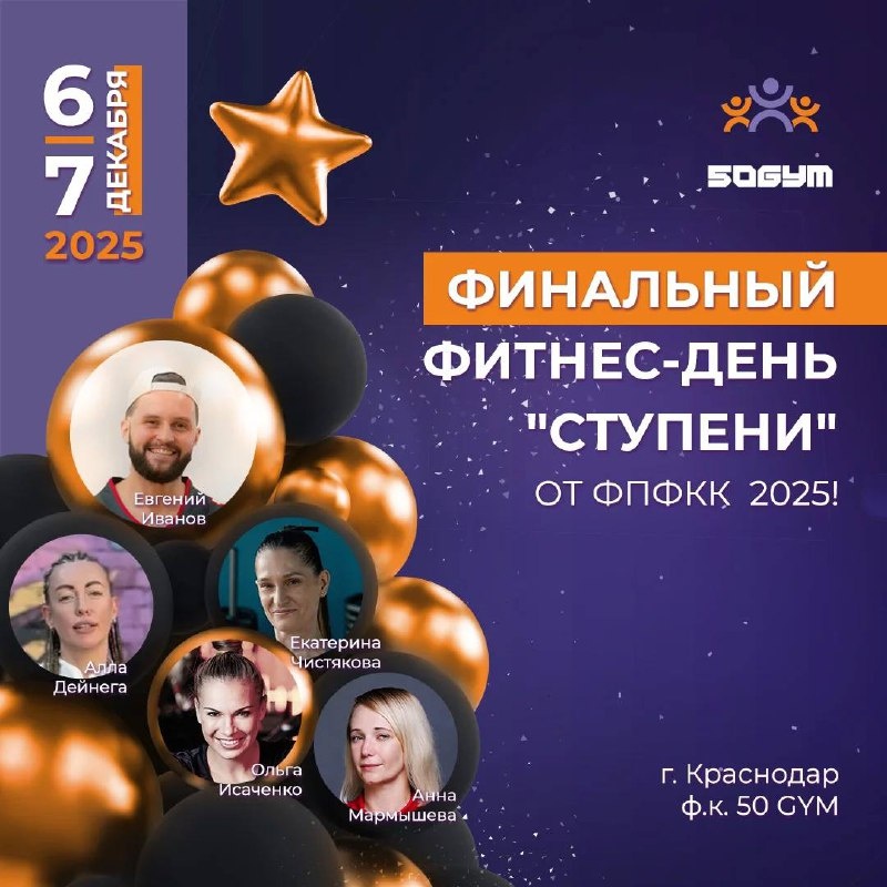 ПОСЛЕДНИЙ ШАНС ВЗБОДРИТЬСЯ 2025 ГОДА! ⭐️ Приглашаем на заключительное фитнес событие года — ФИНАЛЬНЫЙ ФИТНЕС-ДЕНЬ "СТУПЕНИ" ОТ ФПФКК 2025! Пусть трудовые скучные дни останутся позади, впереди — яркие эмоции, мощный заряд энергии и море удовольствия! 🎯 Для вас подготовили потрясающую программу: ✔️Лучшие инструкторы ЮФО проведут эксклюзивные мастер-классы. ✔️Интенсивные мастер классы и воркшопы которые заставят ваше сердце биться быстрее. Игры, розыгрыши, лотерея, призы от спонсоров и незабываемый тимбилдинг. ⭐️ Это последний шанс встретиться с любимыми экспертами, прокачать тело и дух и подарить себе праздник активного долголетия! 🎩 dress code - новогодний 🔥🔥🔥🔥🔥🔥🔥🔥🔥🔥🔥 До встречи на фитнес-дне зимой 2025! 🎄Пиши «СТУПЕНИ» в комментариях для бронирования места по самым лучшим условиям! ПодробностиРегистрация Вопросы: @profitness_krd Навигация по нашим каналам и материалам: РАСПИСАНИЕ 2025г. ЧАТ ФИТНЕС ТРЕНЕРА ЗАКРЫТЫЙ КЛУБ ФитнесНовости ФитнесРаботаКраснод