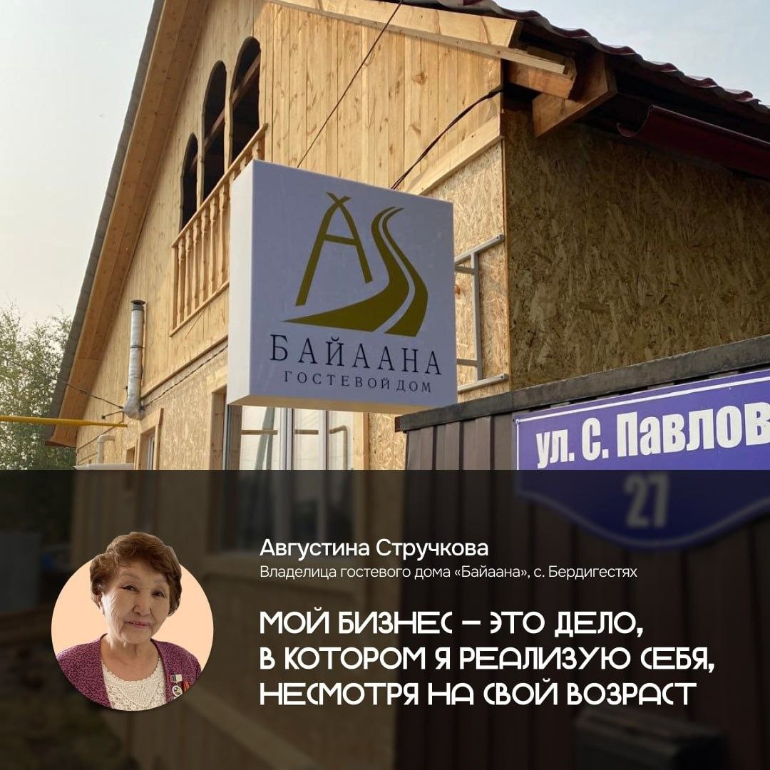 История бизнес-успеха пенсионерки из Горного улуса В Бердигестяхе маловато мест для размещения гостей и командированных, подметила однажды пенсионерка Августина Стручкова. Это озарение подтолкнуло ее к решению превратить старый дом в место для бизнеса. Ее гостевой дом «Байаана» открылся при поддержке Центра «Мой бизнес» и Фонда развития предпринимательства, которые по президентскому нацпроекту «Эффективная и конкурентная экономика», помогли с рекламой, финансированием стройки и благоустройством. Вот уже 6 лет радушная хозяйка принимает гостей. Сейчас ей 80 лет, она инвалид III группы, является ветераном труда, обладателем нагрудного знака «Дети войны», почётного знака «За вклад в развитие Горного улуса», а также почётным гражданином Бердигестяхского наслега. Пример Августины Стручковой вдохновляет весь Горный улус!