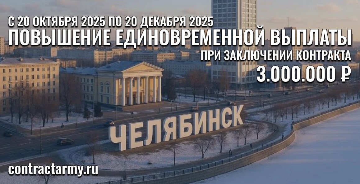 В Челябинской области в 20.10.2025 года повысили единовременную выплату до 3 000 000 ₽. Это включает 2 600 000 ₽ региональных средств (2 400 000 ₽ от региона и 200 000 ₽ – из муниципалитетов) и 400 000 ₽ федеральных выплат. Повышение действует только с 20 октября по 20 декабря 2025 года: за первые подписанные в этот период контракты. По оценке областных властей, с учётом всех выплат и зарплаты контрактник за первый год службы может заработать от 5 520 000 ₽ что сопоставимо с Московскими выплатами за год.