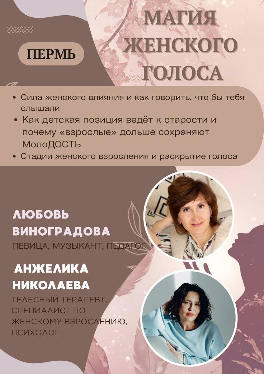 Кто у нас тут из Перми или окрестностей? Приглашаю на игровой тренинг «МАГИЯ ЖЕНСКОГО ГОЛОСА» 29 октября в 19:00 ✅ Поговорим о взрослении через голос. ✅ Разберём секреты молодости и женского влияния ✅ Научимся простым приёмам стабилизации психики , через телесные и голосовые практики ✅ Пообщаемся и проведём прекрасно время По вопросам регистрации пишите Любе https://vk.com/lubavamira По вопросам записи на индивидуальные консультации и телесные сессии со мной в Перми , тоже уточняйте у Любы . Есть 3 места