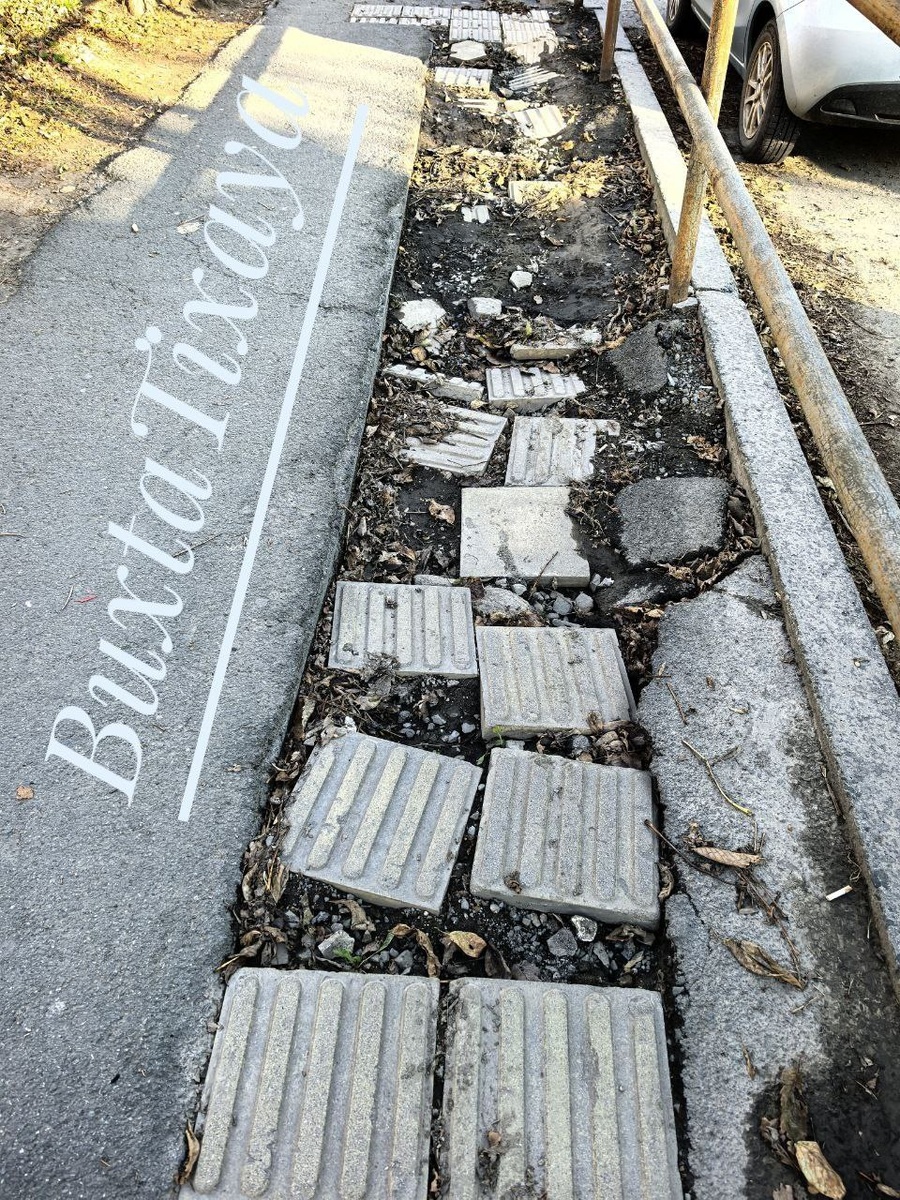 Тактильная плитка от Космонавтов 5 вниз к Космонавтов 13. Куда тут слабовидящим ходить? Тут хоть бы всем зрячим пройти