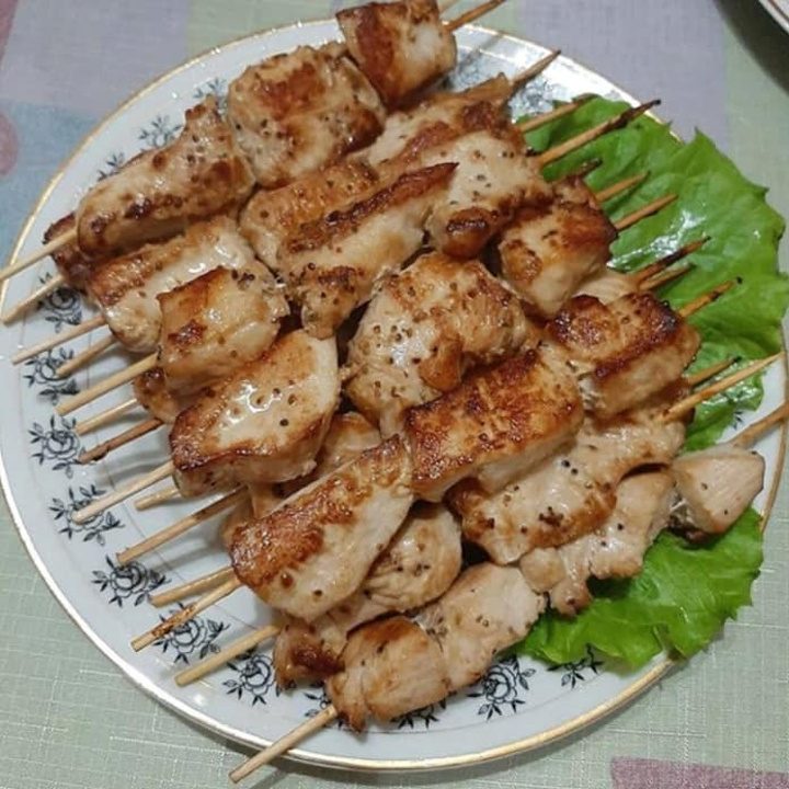 ✔Филе куриной грудки (или индейки) - 400 г; ✔Горчица (столовая или дижонская) - 1 ч. л.; ✔Масло растительное - 1 ч. л.; ✔Соль, перец черный молотый - по вкусу Нарезать на порционные кусочки любое белое мясо птицы (курица, индюк). Солим, перчим, добавляем чайную ложку горчицы, чайную ложку подсолнечного масла. Убираем в холод на полчаса. Далее нанизываем на деревянные шпажки, предварительно замоченные в воде (15 минут). Запекаем в духовке до готовности при температуре 200°. КБЖУ шашлычков из куриного филе (на 100 г) – 152/26/5/0. К шашлычкам можно подать томатный соус без сахара, например, с инулином. Калорийность такого соуса (на 100 г) – 40-50 ккал. Он содержит около 16% углеводов. www.vysotamed.ru Рецепт на странице Автор рецепта – Liya Yulchevskaya Расчёт КБЖУ сделан с помощью Telegram-чат-бота https://t.me/vesipitaniebot © Почтенный возраст Online и Рецепты для диабетиков