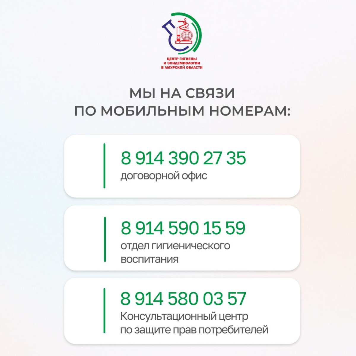 ⚡️Временно наши основные контактные номера недоступны. Возникли технические проблемы со стороны провайдера Уточнить необходимую информацию можно по мобильным телефонам: Договорной офис (лабораторно-инструментальные исследования и измерения; дезинфекция, дератизация, дезинсекция; разработка программ производственного контроля; санитарно-эпидемиологическая экспертиза) 📲89143902735 Отдел гигиенического воспитания (гиг.подготовка, оформление медицинских книжек) 📲89145901559 Консультационный центр по защите прав потребителей 📲89145800357 Вы также можете задать интересующие вопросы в наших соцсетях: 💬Телеграм 💬ВКонтакте 💬Одноклассники