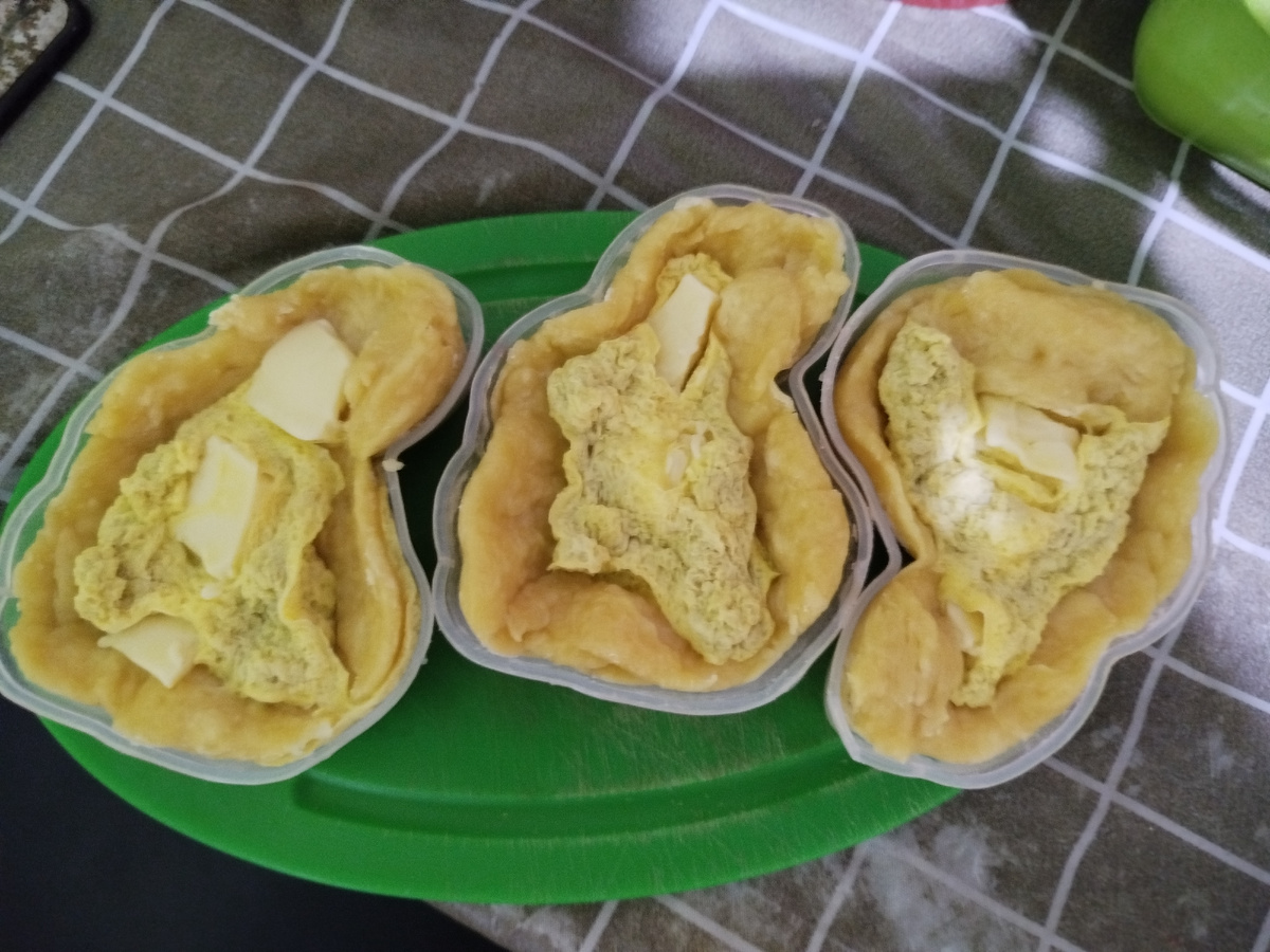 Разделить тесто на три части, каждую раскатать и положить в формочку, сделав стенки по краям. Во внутрь положить сыр. Выпекать на пару 10 минут после закипания воды, потом налить в каждую булочку немного взбитого с щепоткой соли яйца, и выпекать ещё 10 минут.