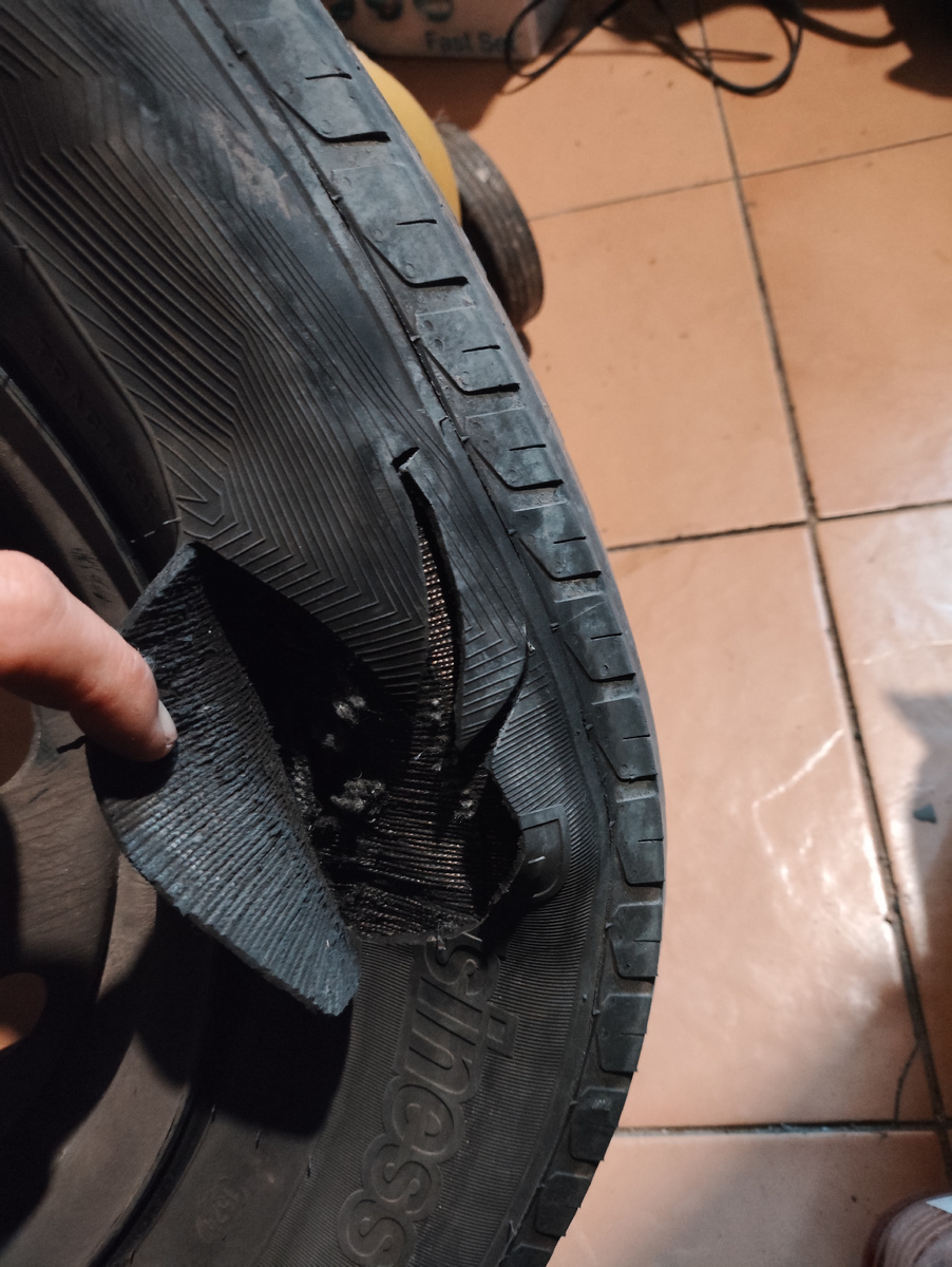 Весной этого года поменял все четыре колеса на летнюю резину cordiant business cs2 215/70r15c. Последнее время брал легковую резину хотя по идее на микроавтобус надо ставить цэшку. Но учитывая небольшой пробег до состояния непотребства резины решил снова перейти на коммерческую. Выбор был не очень большой и из бюджетного сегмента решил взять российскую, а не китайскую. В общем ехал я ночью и услышал резкий звук, как-будто прилетело что-то по кузову. Была мысль что взорвалось колесо, но болтанки руля не появилось и увода тоже не было, поэтому я просто продолжил движение. Через 20км. руль начало немного подёргивать и я съехал на обочину. Выйдя из машины я услышал шипение - спускало колесо. Но оно не просто спускало - оно уже было взорваным! Разбираться сразу не стал - только быстро поставил запаску и поехал дальше. По дороге всё думал - как так получилось что я проехал на взорвавшейся колесе 20км и не почувствовал этого?(На обратном пути я специально замерил километраж от точки взрыва