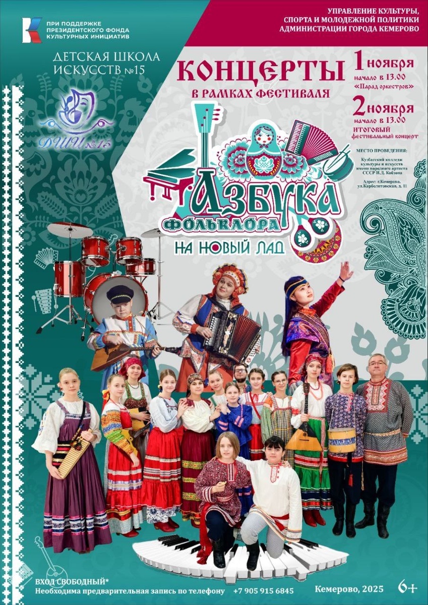 Кемеровчан приглашают на фестиваль «Азбука фольклора на новый лад» С 14 октября по 2 ноября в Детской школе искусств №15 горожан ждут ежедневные мастер-классы культурных деятелей, лекции и выставки, игровые программы. Мероприятие организовано при поддержке Президентского фонда культурных инициатив. Фестиваль «Азбука фольклора на новый лад» объединит не менее 14 фольклорных коллективов и 9 ансамблей и оркестров русских народных инструментов из разных уголков Кузбасса. Перед зрителями выступят более 260 артистов. ✔️Кульминацией фестиваля станут два концерта на сцене Кузбасского колледжа культуры и искусств имени народного артиста СССР И.Д. Кобзона. ▪️1 ноября в 13:00 состоится «Парад оркестров» - впервые на одной сцене выступят оркестры и ансамбли русских народных инструментов (ученические и студенческие). ▪️ 2 ноября гостей ждут фольклорная игровая программа и концерт творческих коллективов Кемеровского государственного института культуры. Так, ансамбль народной музыки «Любава» вме