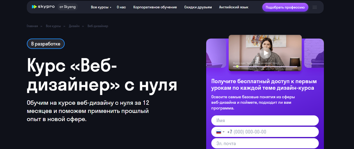 Подойдёт новичкам без опыта и тем, кто хочет перейти в сферу UI/UX. В исходнике подчёркнут старт с нуля и возможность освоить основы веб-дизайна в онлайн-формате.