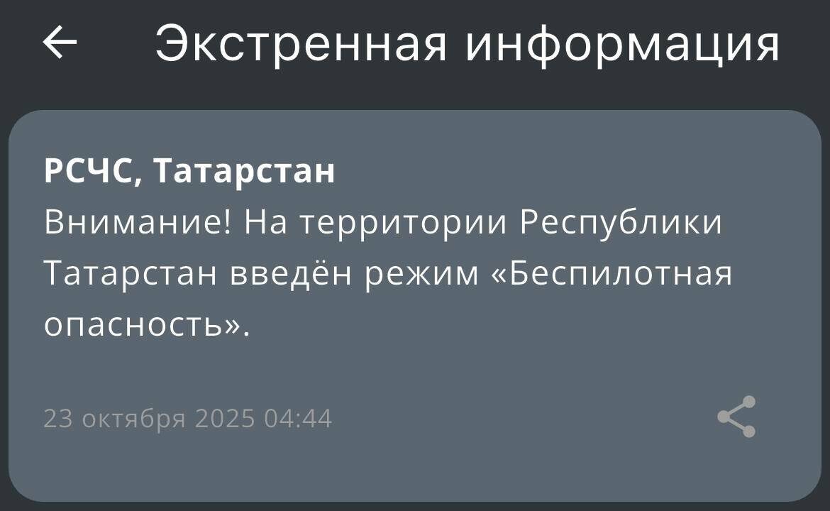 Сегодня в 04.44 в Татарстане ввели режим беспилотной опасности. Информация об этом появилась в официальном приложении МЧС России.