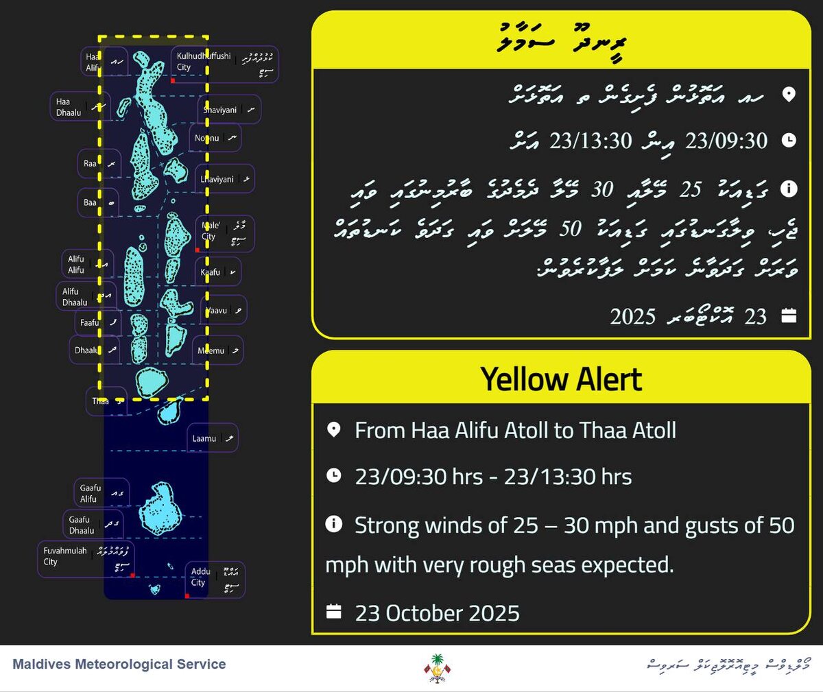 Жёлтое предупреждение объявлено с атолла Хаа Алифу до атолла Тхаа с 09:30 до 13:30.