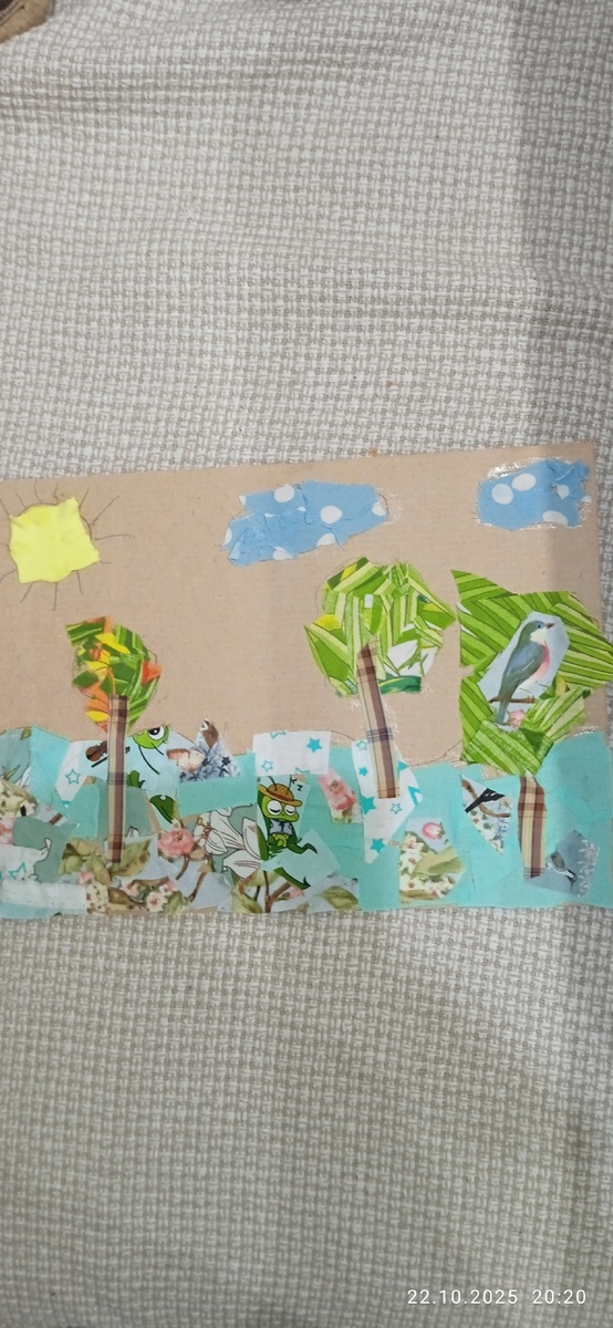 Нашла кусочек картона, лоскутки и клей карандаш. Думала про клей ПВА, но там кисточка нужна , да и извозючится вся пока на ткань клей нанесёт))) Нанесла на картон "рисунок" карандашом. Схематично луг,деревья,небо. Постаралась объяснить свою задумку внучке.