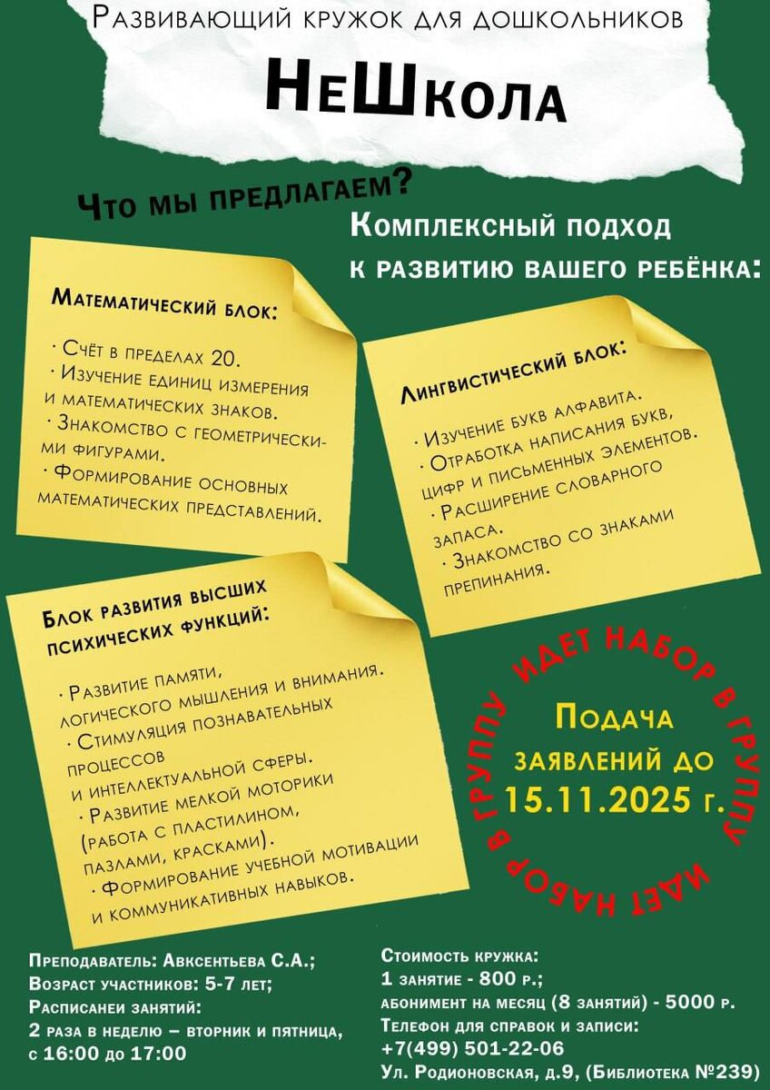 🎓 Привет, будущие отличники! Приглашаем вас в увлекательное путешествие в мир чисел, букв и открытий! 🌟 📚 Что будем делать? · 🧮 Считаем и решаем в пределах 20, играем с цифрами и знаками. · 🔺 Изучаем геометрические фигуры и строим из них целые миры! · 🔤 Знакомимся с буквами, учимся их писать и складывать в слова. · ✍ Развиваем ручки с помощью пластилина, пазлов и красок. · 🎯 Тренируем память, логику и внимание через весёлые игры и задания. · 💬 Учимся общаться, дружить и работать в команде. 👧🧒 Для кого: мальчики и девочки 5–7 лет 📅 Когда: 2 раза в неделю — вторник и пятница 👩🏫 Кто ведёт: Авксентьева Светлана — педагог, который знает, как подружить ребёнка с математикой и грамотой! 🚀 Места ограничены! Записывайтесь и давайте открывать новые таланты вместе! 💫 #дети #занятиядлядетей #развитиедетей #подготовкавшколе #математика #грамота #логика #творчество #обучениеигра #дошкольники #раннееразвитие #окцсзао