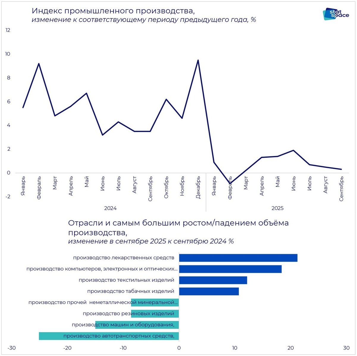 Промышленное производство в сентябре 2025 В сентябре этого года индекс промпроизводства превысил показатель прошлого сентября всего на 0.3% - ещё не спад, но уже очень близко к нему - и это самый низкий результат по этому индикатору за последнее время (февраль 2025 не в счёт, потому что был на день короче февраля 2024). При этом сезонно скорректированный индекс месяц-к-месяцу уже падает (и уже не в первый раз за год) - на 1% к августу 2025. В отраслевом разрезе ситуация стандартная: всё очень плохо в автопроме (-25% к прошлому сентябрю, но рост по сравнению с августом этого года!) и около него, в небольшом, но стабильном, минусе добыча и многие "гражданские" отрасли. Растут производство лекарственных средств (+21.2% к прошлому сентябрю!), компьютеры-электроника-оптика (традиционно, +18.4%), довольно внезапно текстильные изделия и уже традиционно - табачная промышленность.