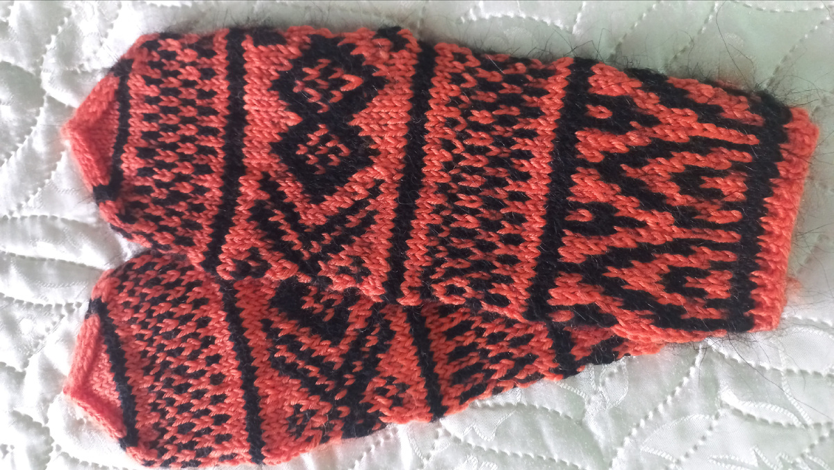 Для манжеты узор придумала сама, а для ладошки — узор из книги «Русские узоры». Сделала ВТО (влажно-тепловая обработка) и сижу, смотрю на свои варежки... А носить-то не с чем! Придётся и шапку такую вязать. 😂