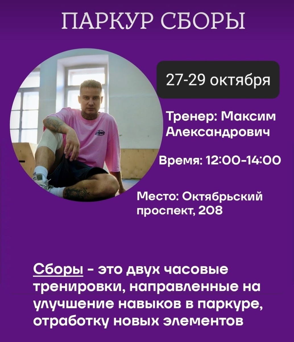 Паркур сборы с Максимом Александровичем в зале Открытый материк 27, 28 и 29 октября В Москве с 27 по 29 октября пройдут трёхдневные паркур-сборы под руководством тренера Максима Александровича. Мероприятие предоставляет возможность погрузиться в дисциплину паркура, сочетающую в себе искусство эффективного преодоления препятствий и развития физических возможностей. Участников сборов ждут интенсивные двухчасовые тренировки, направленные на всестороннее развитие. Программа включает в себя не только отработку технических элементов паркура, но и специализированную физическую подготовку для повышения силы и выносливости, а также упражнения на растяжку для развития гибкости и предотвращения травм. Основной фокус будет сделан на освоение и закрепление новых элементов, что позволит трейсерам качественно прогрессировать. Тренировки запланированы на три дня подряд: понедельник, вторник и среду, с 12:00 до 14:00. #паркур #сыктывкар #упражнения Подробнее...