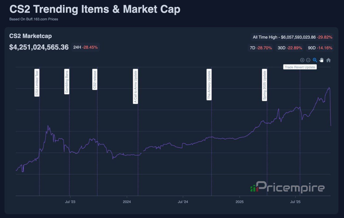 Капитализация скинов составляет $4,2 млрд (ранее $5,9 млрд).