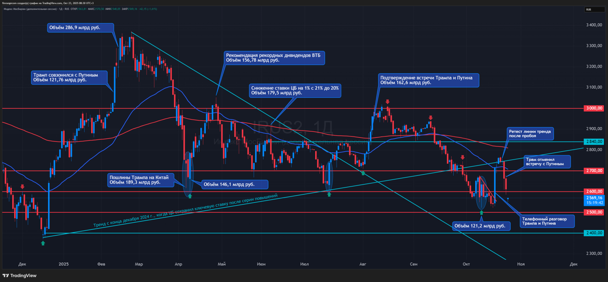 Российский рынок акций вчера весь день оставался вялым на низких объёмах — участники ждали решения Трампа по встрече с Путиным, которое он объявил уже после закрытия вечерней сессии. Из-за этого рынок почти не реагировал на заявления МИДов Венгрии и России. Каждый отскок быстро продавали, и рынок простоял до вечера в боковике. После 22:00 по Москве появились новости о санкциях США против «Роснефти» и «Лукойла». Минфин США сообщил, что вводит дополнительные ограничения «в связи с отсутствием у России серьёзной заинтересованности в мирном процессе». На этом естественно по пустым стаканам рынок падает ниже 2600 пунктов по индексу МосБиржи. Позже Трамп заявил, что отменяет встречу с Путиным в Будапеште: «Сложилось впечатление, что мы не достигнем нужной цели, но мы встретимся в будущем», – сказал он. Получается, инсайдеры западных СМИ снова оказались правы. Похоже, кто-то из окружения Трампа уже понимал, как прошли переговоры Лаврова и Рубио и как президент США отреагирует. Что в итоге име