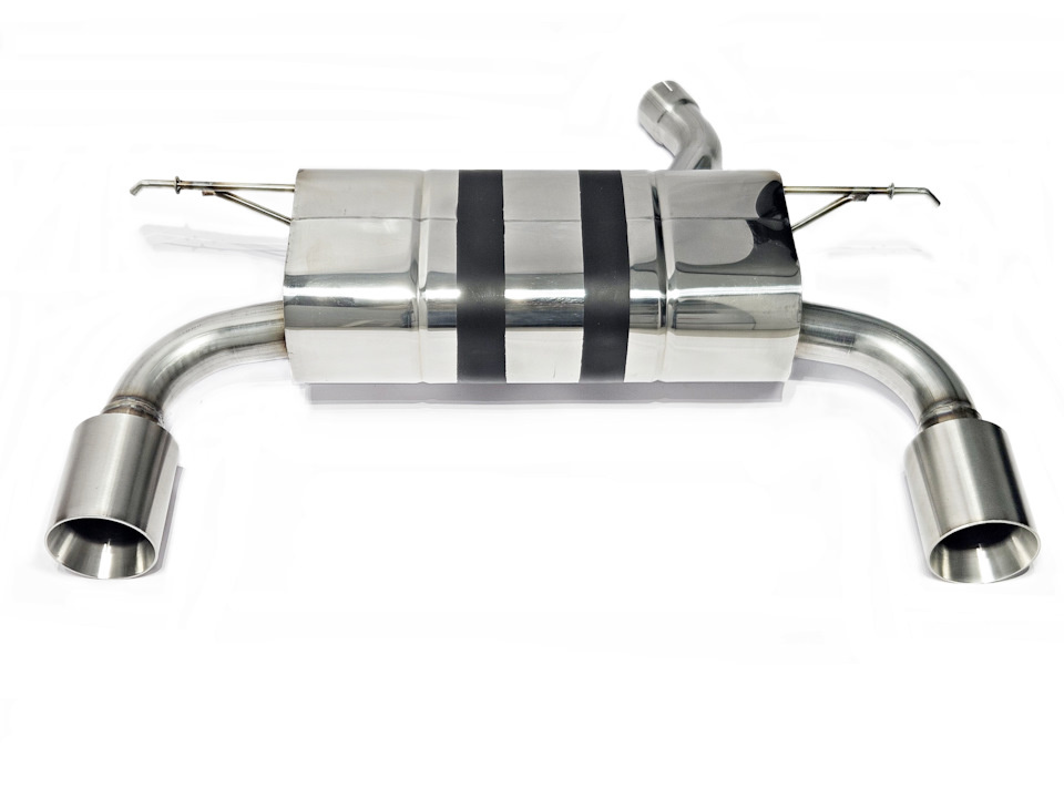 Задняя часть выхлопной системы для семейства автомобилей BMW 3-й серии 340i (F30, 31 рестайлинг) с двигателем B58B30 3.0 л, 326 л.с. Глушитель и насадки серии Performance. Глушитель выполнен полностью из нержавеющей стали AISI 304, в том числе и внутренняя, цельная перфорированная труба.