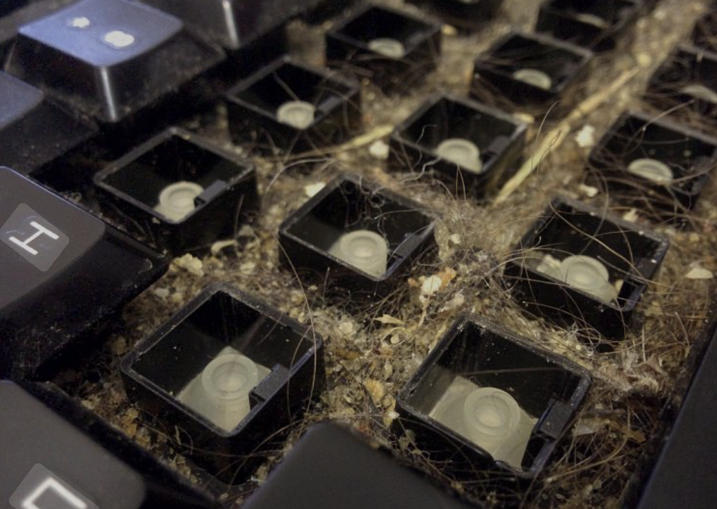 - 🍪 Крошки и крупный мусор: Остатки еды, песок, кусочки засохшей грязи, которые провалились под клавиши.