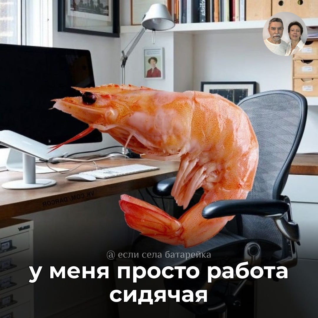 #рыбныйдень, дорогие! Не будем ходить вокруг да около — берём быка за рога! — Позвольте, а где же рыба? — спросите вы. — А чем вам не рыба? (палец вверх) Хоть и креветка! А ещё — кого она вам напоминает? (Вопрос с подвохом. Звучит саркастический смех) Вот так мы все сидим, сидим... а потом в зеркало смотрим — и там вот такоэ. Да-да, уже даже термин придумали — компьютерная шея. В профиль особенно «красиво»: то ли на гуся становимся похожи, то ли на креветку. И ладно бы только красота пострадала! Мы-то уже в том возрасте, когда нас и так любят. Но... При наклоне головы вперёд (а она, между прочим, весит 5–6 кг!) центр тяжести смещается, и нагрузка на шею возрастает в 3–4 раза. То есть вы вроде сидите спокойно, а в это время шея и верх спины ежедневно держат гирю по 15–20 кг. И понеслось: передние мышцы шеи укорачиваются, задние — тянут голову назад. Сосуды в области шеи сжимаются — мозг получает меньше кислорода. Позвонки смещаются, и организм, спасая ситуацию, формирует в районе 7
