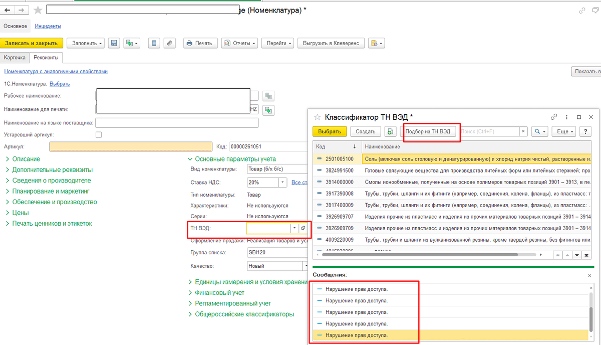 Нарушение прав доступа к добавлению нового значения в классификатор ТН ВЭД через подбор ТН ВЭД в 1С Комплексная автоматизация 2.5.