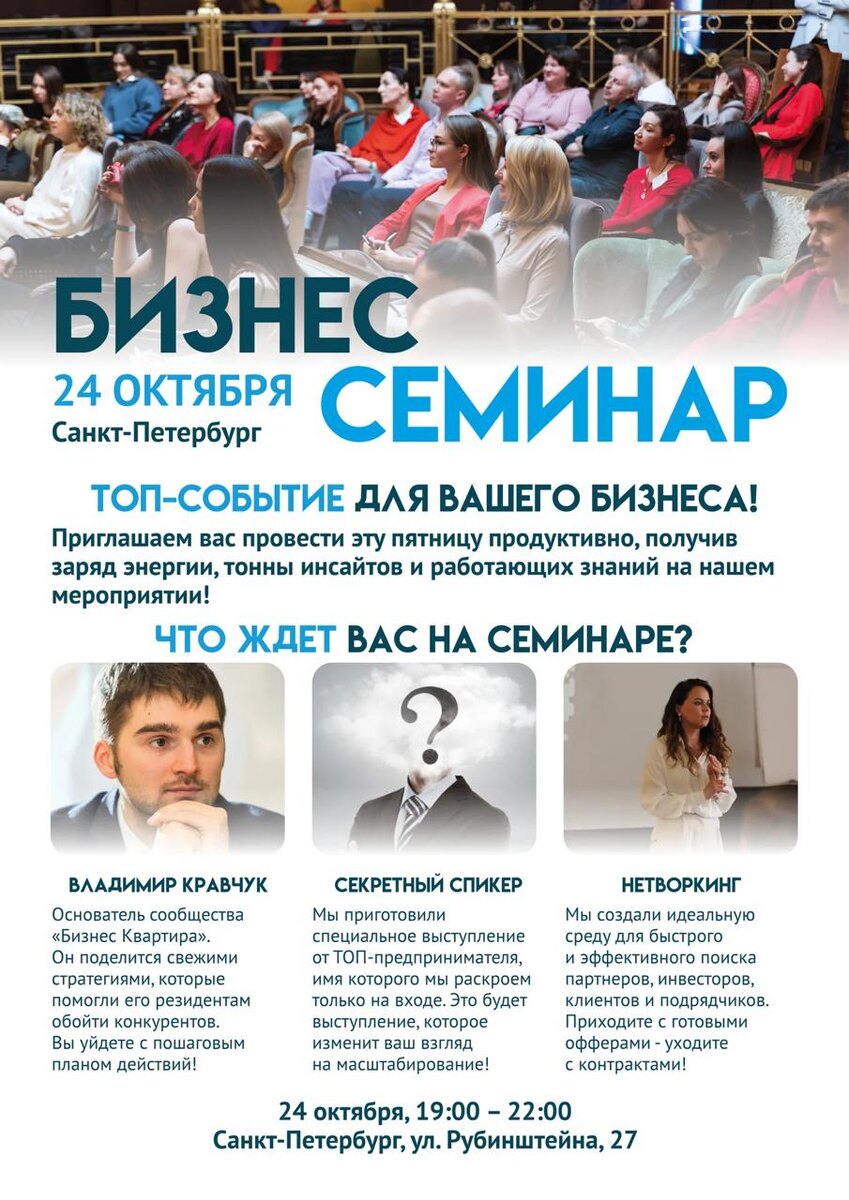 🎤Бизнес-семинар в Петербурге! Уже в эту пятницу я выступлю на открытом семинаре и нетворкинге. Это живое общение, энергия, инсайты и работающие знания. Приходите! ТОТ САМЫЙ СЕКРЕТНЫЙ ГОСТЬ – это я! 👑 Участие бесплатное — нужно зарегистрироваться по ссылке. Дата: 24 октября Время: 19:00 Адрес: Санкт-Петербург, ул. Рубинштейна, 27