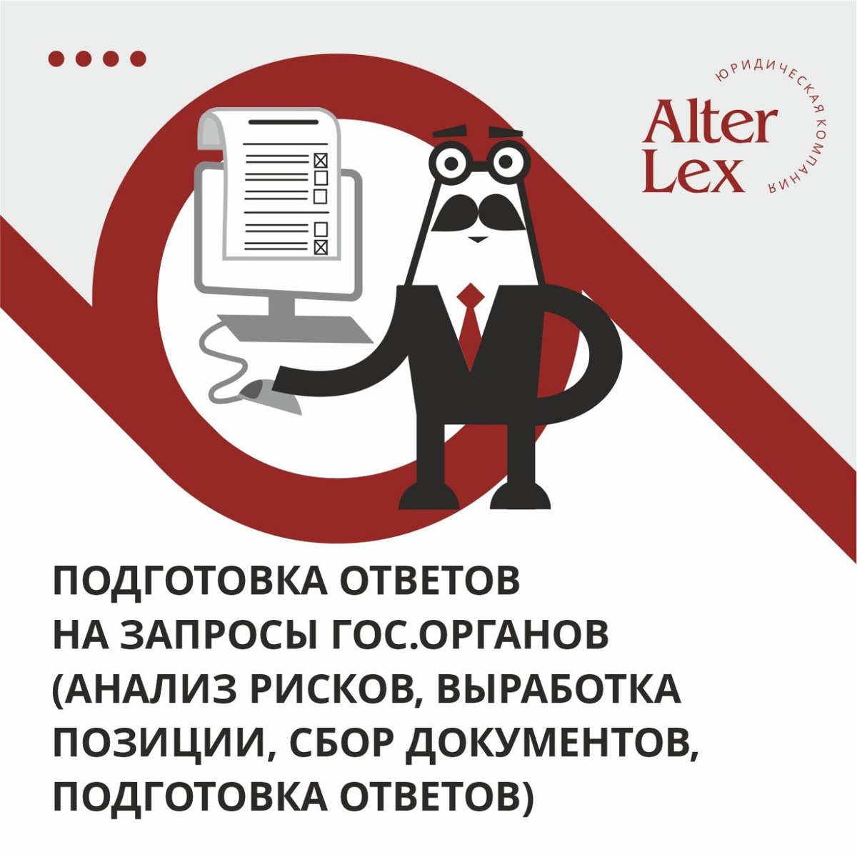 Подготовка ответов на запросы государственных органов 📘 Описание услуги Подготовка ответов на запросы государственных органов — это профессиональная услуга, направленная на правильное и своевременное оформление официальных ответов организациями или индивидуальными предпринимателями в адрес контролирующих и надзорных ведомств (ФНС, Роскомнадзор, Росприроднадзор, прокуратура, МВД и др.). Юристы компании анализируют содержание поступившего запроса, определяют его правомерность, составляют корректный, юридически выверенный ответ и обеспечивают соблюдение сроков предоставления информации. 🎯 Цель: Защитить интересы клиента при взаимодействии с государственными структурами. Исключить риски привлечения к ответственности за неполный или некорректный ответ. Обеспечить юридическую точность и соответствие требованиям законодательства РФ. ⚙️ Что входит: Анализ поступившего запроса — проверка полномочий органа, законности требований, сроков и формы ответа. Подготовка проекта ответа — юридически об