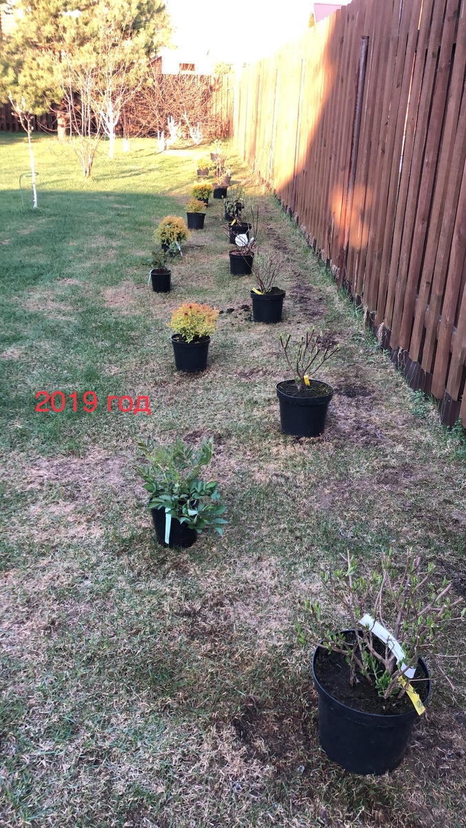 2019 год. Кустики я сажала 2,3 летние, формировала их сразу при посадке, некоторые пришлось очень коротко обрезать. Сорта выбирала самые крупные, ну это и понятно, забор не особо красивый от застройщика и смотреть на цветущие кусты приятнее.