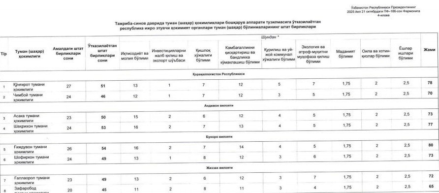 Tуман ва шаҳар ҳокимликларига кенг ваколатлар берилмоқда “Ҳудудларни барқарор ижтимоий-иқтисодий ривожлантириш учун туман (шаҳар) ҳокимликлари фаолиятини тубдан такомиллаштиришга доир қўшимча чора тадбирлар тўғрисида” ги Президент Фармонига биноан 2026 йил 1 январдан бошлаб тажриба-синов тариқасида 9 та ташкилот: ➡️ Иқтисодиёт ва молия вазирлиги ➡️ Камбағалликни қисқартириш ва бандлик вазирлиги ➡️ Инвестициялар, саноат ва савдо вазирлиги ➡️ Қурилиш ва уй-жой коммунал хўжалиги вазирлиги ➡️ Қишлоқ хўжалиги вазирлиги ➡️ Экология, атроф-муҳитни муҳофаза қилиш ва иқлим ўзгариши вазирлиги ➡️ Маданият вазирлиги ➡️ Оила ва хотин-қизлар қўмитаси ➡️ Ёшлар ишлари агентлиги туман (шаҳар) бўлинмалари ҳокимлик тузилмасига ўтказилади. Янгилик Жиззах вилоятидан Ғаллаорол ва Зафаробод туманларида амалга татбиқ этилади. Қарор билан танлаб олинган туман (шаҳар) ҳокимлари ўринбосарлари сони 4 нафар бўлади. Каналимизга обуна бўлинг ва сўнгги янгиликларни кузатиб боринг Jizzaxnews |Тelegram | Faceboo