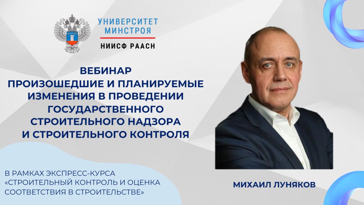 🔔 СЕГОДНЯ ПРОЙДЕТ ВЕБИНАР УНИВЕРСИТЕТА МИНСТРОЯ О НОВЫХ ПРАВИЛАХ СТРОИТЕЛЬНОГО КОНТРОЛЯ ➡️ Сегодня, 23 октября 2025 года, в 11:00 (Мск) Университет Минстроя НИИСФ РААСН проведет бесплатный вебинар «Произошедшие и планируемые изменения в проведении государственного строительного надзора и строительного контроля» 🎯 Мероприятие проходит в рамках экспресс-курса «Строительный контроль и оценка соответствия в строительстве: практические аспекты» и направлено на разъяснение последних изменений в законодательстве, регулирующем строительную отрасль 🎤 Спикером выступит Михаил Александрович Луняков — заведующий корпоративной кафедрой Министерства строительства и ЖКХ Российской Федерации НИУ МГСУ, доктор экономических наук, профессор, Почетный строитель России и Почетный работник Ростехнадзора ➡️ На вебинаре вы узнаете о новых нормативных документах, планируемых изменениях Градостроительного кодекса и внедрении цифровых технологий в систему контроля качества строительства. Участники узнают,
