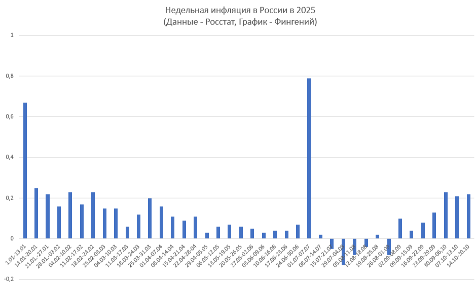 Каждую неделю сейчас цены в России официально растут более чем на 0,2%. За последнюю неделю они прибавили 0,22%, ранее было 0,21%, 0,23%. С - Стабильность. Нетрудно посчитать, что такими темпами они прибавляют примерно 1% в месяц. Это соответствует высокому двухзначному уровню инфляции в годовом выражении.
