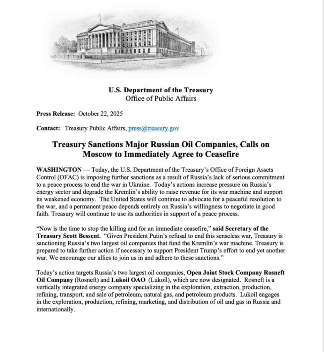 Подведу итоги последних инициатив США. Новые санкции, конечно, своего рода эскалация, так как «Роснефть» и «Лукойл» добавлены в список специально обозначенных граждан (SDN), что означает полную блокировку. Все активы и имущественные интересы «Роснефти» и «Лукойла», находящиеся в США или под контролем американских лиц, блокируются. Любые операции с участием этих компаний запрещены для граждан и юридических лиц США. Теперь им запрещены любые транзакции, и вводится угроза вторичных санкций для иностранных банков и компаний, продолжающих бизнес с ними. Ранее компании были «отрезаны» только от капитала, но могли вести некоторые операции, а теперь они полностью «отрезаны от доллара». Предусмотрен период на свертывание сделок до 21 ноября 2025 года. Тут стоит сказать, что Индия и Китай ведут операции в юанях. Трамп заявил, что информация The Wall Street Journal о том, что США разрешили удары вглубь дальнобойными ракетами, – фейк. Это он повторил на пресс-конференции с генеральным секрета