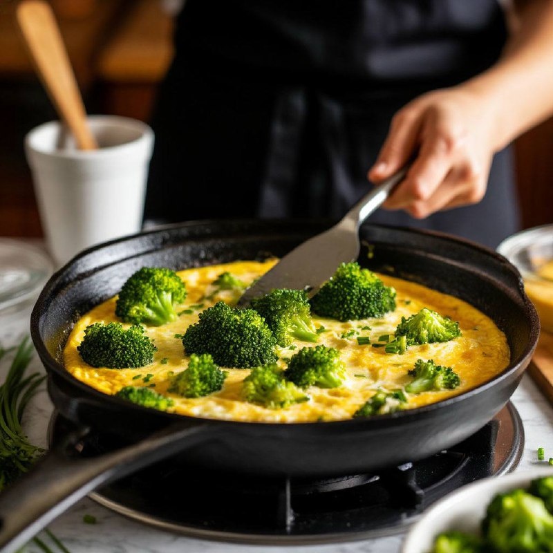 Ингредиенты: - 2 яйца - 1/4 стакана молока - 50 г брокколи - Соль и перец по вкусу Приготовление: 1. В глубокой миске взбейте яйца с молоком, солью и перцем. 2. Добавьте нарезанную брокколи и хорошо перемешайте. 3. Разогрейте сковороду на среднем огне и смажьте ее маслом. 4. Вылейте смесь в сковороду и готовьте, пока омлет не станет золотистым сверху и снизу (около 3-4 минут). 5. Переверните омлет и готовьте еще 1-2 минуты, пока он не станет полностью готовым. 6. Подавайте горячим, посыпав сверху тертым пармезаном или зеленым луком, если хотите. Приятного аппетита!