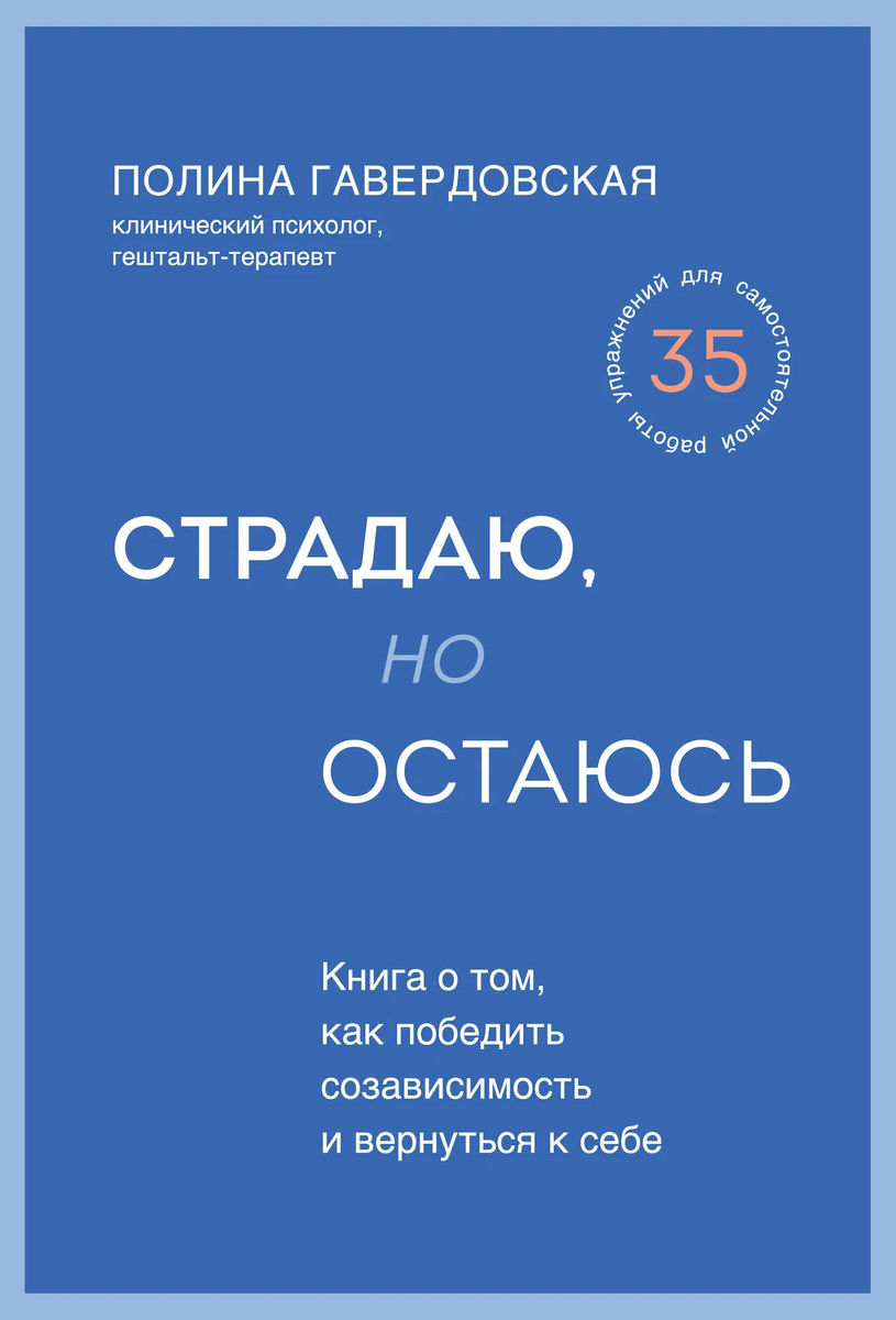Книга Полины Гавердовской «Страдаю, но остаюсь. Книга о том, как победить созависимость и вернуться к себе» — глубокое и важное произведение в области психологии, посвящённое теме созависимых отношений. Автор, гештальт-терапевт с более чем 25-летним опытом, рассматривает созависимость не только как психологическую проблему, но и как феномен, затрагивающий многие аспекты жизни и личности. Книга адресована тем, кто находится в созависимых отношениях, кто вырос в дисфункциональных семьях или связан с зависимыми близкими. Гавердовская раскрывает сложности созависимости через призму гештальт-терапии — показывает, как человек теряет себя, растворяясь в другом, и как важно восстановить свою идентичность. Важной частью книги является методическая помощь: возможна систематическая работа над собой с использованием упражнений, ведением дневников и рисованием «карт дня». Также автор подробно объясняет механизмы слияния, предлагает стратегии установления и защиты личных границ, учит опираться на со