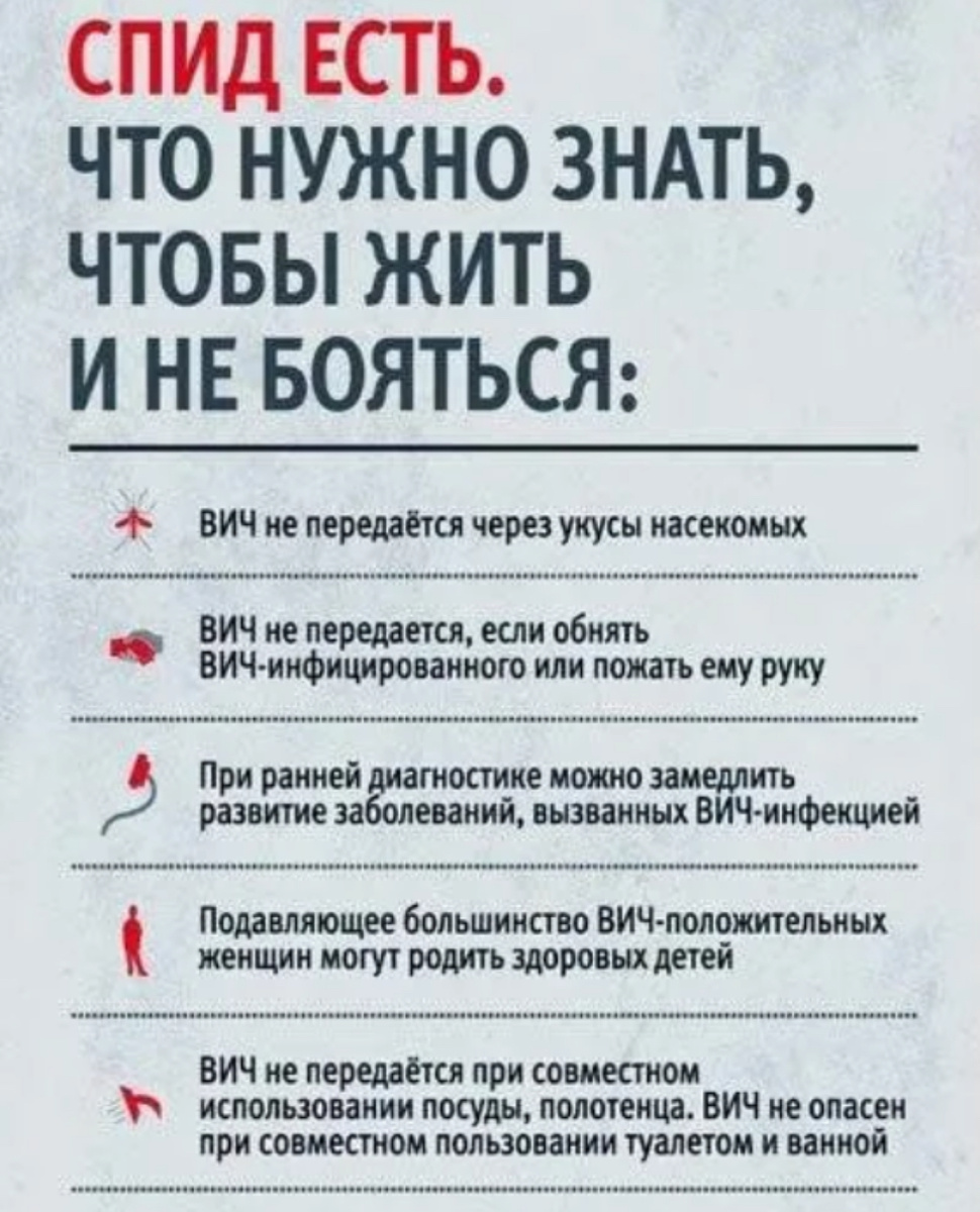 🚫ВИЧ по воздуху не летает. Никто из тех, кто дышал одним воздухом с зараженными ВИЧ в одном, даже самом тесном помещении ВИЧ не заразился. ВИЧ не передается при укусах насекомых или животных.