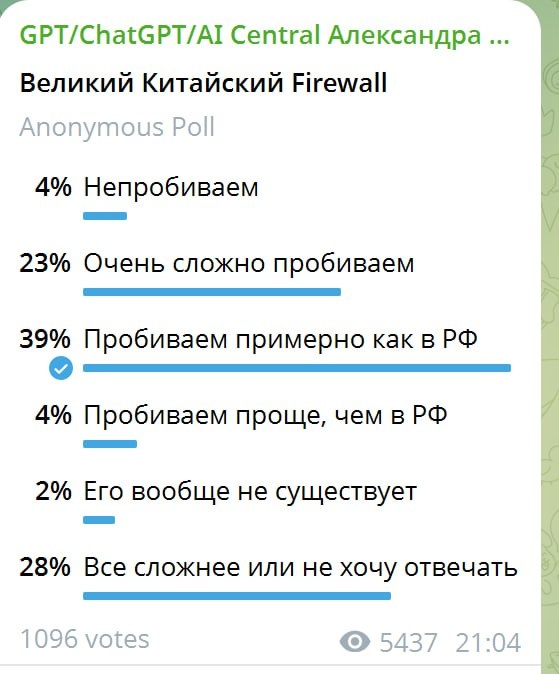 Разоблачение легенды Множество образованных людей и, например, ChatGPT считают, что Великий Китайский Firewall – сложнейшее препятствие на пути к западному интернету. Даже среди подписчиков моего канала – в среднем очень информированных – таких порядка трети-четверти, как считать. В реальности случайный VPN в Китае работает примерно с той же вероятностью, что в России. Этот на мобильнике да, а на десктопе нет, этот наоборот, а тот работает везде. Понятно, что местные выбирают работающие. На телефоне иностранца Firewall по умолчанию вообще не существует. Интернет по роумингу родной сим-карты обходит все блокировки, он из страны оператора работает. Ладно, предположим, это дорого. Так eSIM для путешественников (по крайней мере, Airalo, другие не пробовал) тоже работает мимо ограничений, все заблокированное в Китае свободно открывается. Некоторые пишут, что это потому, что реально Airalo гонконгские, а не китайские симки продает – и связь дешевая, и блокировок нет. Не проверял. P.S.: Х